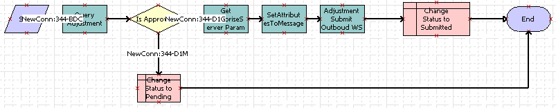• Get EnterpriseServer Param. If the adjustment request is approved, then it gets the parameters from the existing server, such as the enterprise server name, language, and locale, to add to the adjustment request message in the outbound Web service, and then it proceeds to the next step.