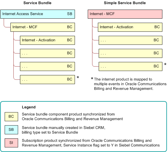 In this example, the activation fees and usage fees are simple products, the rate plans, features, and discounts are customizable products, and the SMS is a nested service bundle. Behavior of Service BundlesThe Billing Service Type field for a service bundle is populated with data when the products in the Oracle Communications Billing and Revenue Management application are synchronized with the products in the Siebel application. Examples of values for the Billing Service Type field follow: To see the Billing Type field and the Billing Service Type field for a service bundle or a product in that bundle, navigate to the Administration - Product screen, Products view, and select the record for a service bundle or a product in that bundle. Expand the form in the Detail view. The Billing Type field and the Billing Service Type field appear in the Logistics section of the form. After products are synchronized, do not change the values in these fields. Although Siebel Communications provides no validation rules, all product components under a service bundle must have the billing account, service account, and billing profile of the root product in that service bundle. The billing account, service account, and billing profile fields are associated with the line items in an order and are populated when a user creates an order. If you modify, disconnect, suspend, resume, or transfer a service item that relates to a parent service bundle, or if you upgrade or downgrade a promotion for a service item that relates to a parent service bundle, then multiple service charges can be automatically created if the parent service bundle includes child service bundles to which service charges apply. If a service bundle status is updated, then the statuses of the product components in a service bundle are updated. If a customizable product that contains a service bundle is updated, then the status of the service bundle is updated. The SIS OM Order Line Item Update Main workflow updates the status field of order line items, but administrators can configure this workflow to update other fields. About Simple Service BundlesA service bundle is a type of complex product that is created manually in a Siebel application. A simple service bundle is a subscription product that is created in Oracle Communications Billing and Revenue Management, then marked as a service instance in a Siebel application. When an order containing this product is submitted, Oracle Application Integration Architecture recognizes the product as a simple service bundle and creates a service instance in Oracle Communications Billing and Revenue Management. A simple service bundle combines a service bundle and a billing product into a single Siebel CRM product. Combining two products in one can simplify the product hierarchy of a service bundle. Additionally, synchronizing an already-created subscription product from Oracle Communications Billing and Revenue Management minimizes the manual setup steps for a service bundle in Siebel Communications. A simple service bundle can include only products of billing type Event as components. These event products are synchronized from Oracle Communications Billing and Revenue Management. For example, a simple service bundle called Internet Service might have a component event product called Internet Activation. A simple service bundle can be a simple product or a complex product. A simple service bundle that is a simple product represents a single-event product in Oracle Communications Billing and Revenue Management. A simple service bundle that is a complex product represents a multiple-event product in Oracle Communications Billing and Revenue Management. In Siebel Communications, a simple service bundle can be a root-level product, can be nested in another service bundle, or can be nested in a complex product. Comparison of Service Bundles and Simple Service BundlesFigure 1 shows how a specific grouping of services might be set up using service bundle functionality only, and how the same grouping of services might be set up using simple service bundle functionality. On the left, under Service Bundle, the item labeled SB and shaded in blue represents a service bundle manually created in Siebel CRM, with its Billing Type set to Service Bundle. Items labeled BC and shaded in yellow represent service bundle component products synchronized from Oracle Communications Billing and Revenue Management. The Internet Access Service bundle is mapped to the Internet - MCF product, and the Internet - MCF product is mapped to multiple events in Oracle Communications Billing and Revenue Management. On the right, under Simple Service Bundle, the item labeled SI and shaded in pink represents a subscription product synchronized from Oracle Communications Billing and Revenue Management, with its Service Instance flag set to Y. Items labeled BC and shaded in yellow represent service bundle component products synchronized from Oracle Communications Billing and Revenue Management. The Internet - MCF product is mapped to multiple events in Oracle Communications Billing and Revenue Management. In the service bundle, certain features are set up as multiple nested products. For example, Internet Email might be two products, a service bundle product manually configured in Siebel CRM, with an associated component product synchronized from Oracle Communications Billing and Revenue Management. By contrast, in the simple service bundle, the corresponding features are set up as single products. For example, Internet Email might be one product, a subscription product synchronized from Oracle Communications Billing and Revenue Management, then flagged as a service instance in Siebel CRM. Constraints on Simple Service BundlesSimple service bundles operate under the following constraints:
