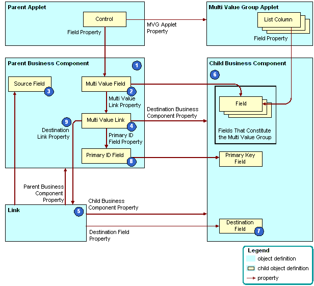 - Destination field. Contains row ID values that reference back to records in the parent business component and uniquely identify the parent for each child business component record. The link identifies the foreign key field in the Destination Field property. In Viewing an Example of a Multi-Value Group Applet, the foreign key field is Account Id. For more information, see About the Destination Field.
