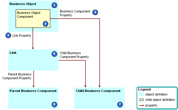 - Link. Each business object component references one link. This link specifies the parent-child relationship that the business object includes. For more information, see About Links.