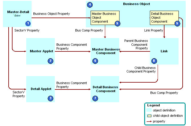 How Siebel CRM Creates a Master-Detail ViewFigure 25 describes how Siebel CRM creates a master-detail view. Explanation of CalloutsSiebel CRM uses the following objects to create a master-detail view: