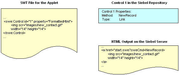 Figure 30 describes how the mapping between controls and IDs work to display an image as a link to add a new contact. The HREF is likely different in your implementation. If you create the correct controls and template mappings, then the Siebel Web Engine creates a URL in the HREF that runs the NewRecord method in the correct context. Siebel Tag Usage in an HTML TagYou cannot nest a Siebel tag in an HTML tag. For example, the following code is not valid. It creates an error:
