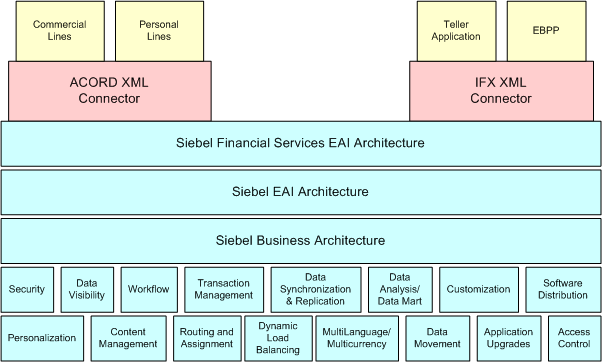 Siebel Financial Services Connector for ACORD P&C and Surety Guide > Overview of Siebel Connector for ACORD XML > Siebel Connector for ACORD XML Architectural OverviewThe Siebel Connector for ACORD XML is a configurable set of components that allow data to be exchanged between your Siebel application and external ACORD-based applications and databases. As shown in Figure 1, the Siebel Connector for ACORD XML is built on top of the Siebel Financial Services EAI Architecture, which in turn is built on top of Oracle's Siebel Enterprise Application Integration (EAI) Architecture. The Siebel Financial Services EAI framework has been built to support XML messaging-based communication infrastructure. Generally speaking, users of Siebel Financial Services must integrate with many different applications through messaging mechanisms. In order to fulfill this requirement, many connectors have to be built in order to support various industry standards. Siebel Financial Services is in a position to quickly and easily build and deploy multiple connectors based on the flexible Siebel EAI Architecture. To demonstrate such flexibility, Oracle has built two connectors —ACORD P&C Connector and IFX Connector—both based on the Siebel Financial Services EAI framework. Please refer to Siebel Financial Services Enterprise Application Integration Guide for more information about the flexible Siebel Financial Services architecture. The Siebel Connector for ACORD XML is based on the ACORD XML standard for insurance industry exchange. In the Property and Casualty business, the main driver to the Internet is the real-time exchange of data between producers, carriers, rating bureaus, service providers, and others. The ACORD XML standard is designed to address these requirements by defining P&C transactions that include both a request and a response message. ACORD partially leverages from the existing Interactive Financial Exchange (IFX) specification as the base protocol while we define an Insurance service containing Personal Lines, Commercial Lines, Surety, Claims, and Accounting transactions. It provides functions such as: