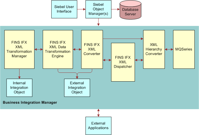The Siebel Connector for IFX XML consists of the following components: Figure 3 shows the connector components. The Connector components are Siebel business services, which are configured in the Workflow view. The integration objects are created using the FINS IFX XML wizard, and they are configured using the Data Map editor. NOTE: For information about Siebel integration objects, converter elements, and XML, see XML Reference: Siebel Enterprise Application Integration. |