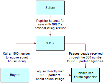 National Real Estate Clearinghouse (NREC) is a fictitious company that participates in the residential real estate industry. It is an agent for people who sell houses. NREC maintains a database of houses for sale and makes this information available to a nationwide network of partner real estate agencies. These real estate agencies represent buyers. Real estate agents use NREC to find houses that match buyer requirements. Through prenegotiated contracts with partner real estate agencies, NREC can close sales with fewer costs than a traditional real estate agency. Figure 6 illustrates how NREC solicits and routes interest directly from a buyer to an agent. To inquire about a house, a buyer calls a toll-free number. NREC records the buyer information and, rather than handling the lead, NREC sends it to an agency in the NREC distribution network.