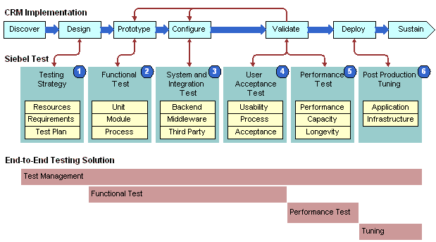 - User Acceptance test. Tests Siebel application usage with business owners and users. You perform this testing on the complete system. You perform usability tests, which test how well the application works during user interactions with the Siebel client when the user attempts to complete specific tasks. You validate how the application supports business processes in the user community in the lines of business and the IT organization. You make sure the application meets performance requirements and that there are no user task failures or prohibitive response times. This is typically a very busy time in the project, when people, process, and technology prepare for the rollout.