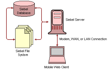 Developing and Deploying Siebel Business Applications > Configuring Siebel Remote > About Siebel RemoteOracle's Siebel Remote allows a Siebel Mobile Web Client that typically operates remotely in a disconnected mode to perform synchronization, which is the process of a laptop, or other remote computer that is periodically disconnected from the network, connecting to a Siebel Server and exchanging updated data and files. Siebel Remote allows field personnel to share current information with members of virtual teams of other mobile and connected users across the organization. A remote client can download a portion of the Siebel database and the Siebel File System to a laptop. The User can access their data locally without a connection to the Database Server, Siebel Server, or file system. Figure 22 illustrates the main parts of Siebel Remote. Between synchronization sessions, the Siebel Remote server prepares transactions that mobile and connected users apply to CRM data. Siebel Server components write the transactions to a separate directory for each mobile user. During the next synchronization session, Siebel CRM downloads transactions and items from the file system. Items from the file system include updated, published, or requested marketing literature, correspondence templates, and other types of file attachments. |