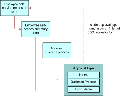 Siebel HelpDesk Guide > Setting Up Employee Self-Service > Linking Self-Service Forms to the InboxTo route an employee self-service form to the Inbox, the form and the inbox must be linked. Figure 8 shows the business process used when linking the form and the Inbox. As an administrator, you can create an approval type to link a form to the inbox. After the approval type is configured, you can reference the approval type name within the employee self-service requestor form. For information about creating an approval type, see Siebel Applications Administration Guide. NOTE: The following procedure is required only for new Employee Self-Service forms, not for preconfigured forms. For more information on creating an Employee Self-Service form, see Designing Employee Self-Service Requestor Forms. This task is a step in Process of Setting Up Employee Self-Service. To link employee self-service forms to the Inbox