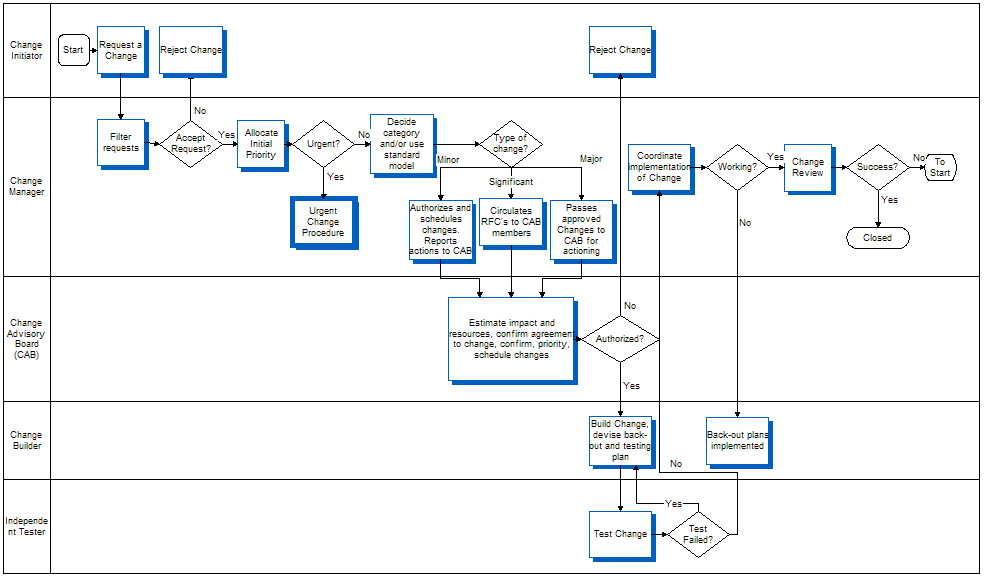 Siebel HelpDesk Guide > IT Service Management Solution Set > Change ManagementError control monitors progress in resolving known errors, and Change Management processes requests for changes. Root cause analysis monitors the impact of problems and known errors on services. If the impact becomes severe, root cause analysis escalates the problem. Change Management or a request for change is a formal way to request a change within the overall IT infrastructure or system. Therefore, a Change Management system can help an organization manage incremental improvements and targeted modifications to a product or process. If a change to the physical environment is required to close a problem record or known error record, then a change record is created. Change Management broadens the scope of management oversight to encompass large-scale modifications such as upgrades to central servers and network or telecommunication system installations. Each request for change associated with the Change Project is assigned a unique identifier, and follows an established process flow consisting of approvals, alerts, tasks (if required), phases, and closure. When the change record is successfully implemented, the record is closed and associated requests for change records and problem records are also closed. The Siebel Change Management solution seeks to ensure standardized methods and procedures for efficient and prompt handling of all changes. The goal is to minimize the impact of change-related incidents on service quality, and consequently to improve the day-to-day operations of the organization. The following sequence is the typical workflow (as shown in Figure 4) for working with Change Management.