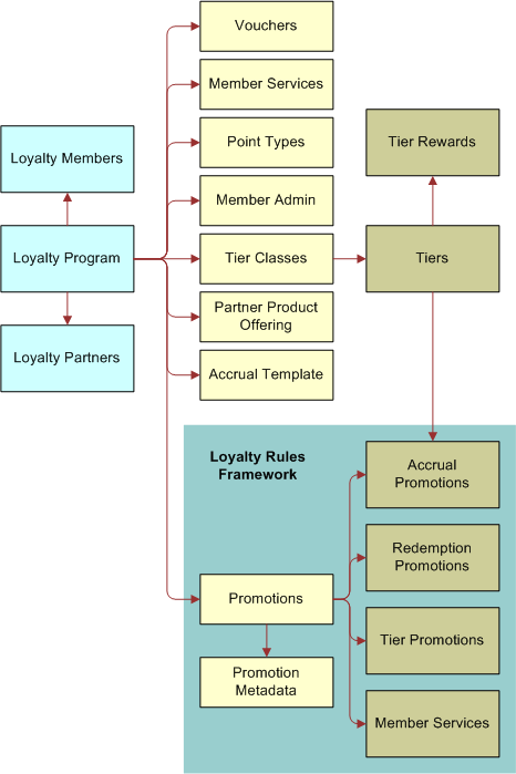 A program is the highest level entity in Siebel Loyalty. Members, tiers, promotions, point values, and so on are all specific to a single program. Some entities such as contacts, accounts, and products can be used across multiple programs. Figure 1 shows the key elements of a loyalty program. Most companies have one loyalty program. A company can have multiple programs if it has two very different sets of memberships bases, accrual and redemption rules, tiers, and so on. For example, a company could have one program targeted at individuals, and another one targeted at corporate accounts. How programs are set up depends on each company's specific requirements. For example, if you want individual members to be able to transfer points to corporate members (such as when an individual flies, and the corporate parent earns some or all of the points), then you would set up one loyalty program with two different types of memberships - individual and account - and probably with different accrual and redemption rules based upon the membership type. This chapter describes how to set up loyalty programs. Before you set up a loyalty program, you must analyze your customer base to see which customers the program must be designed to appeal to. For example, if an airline finds that half of its revenues come from 10 percent of its customers, then it would design the program to appeal to these frequent flyers. For more information, see Roadmap to Working with Siebel Loyalty. After setting up a program, you can set up promotions for that program, which give members bonus rewards beyond the usual program rewards for behavior that you want to encourage. For more information, see Setting Up Siebel Loyalty Promotions. |