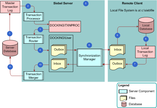Figure 3 illustrates the flow of data through the architecture for Siebel Remote. For more information about the server components and files that this architecture uses, see How Siebel Remote Uses Siebel Servers.