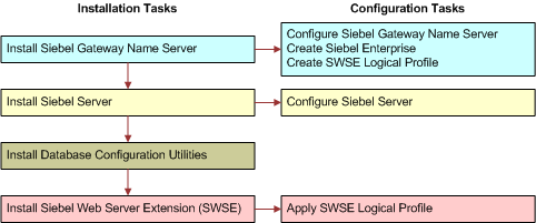 Figure 3 presents a simplified view of the installation and configuration tasks for Siebel CRM server-based modules that apply in an upgrade installation case. You install Database Configuration Utilities with the first installed Siebel Server.