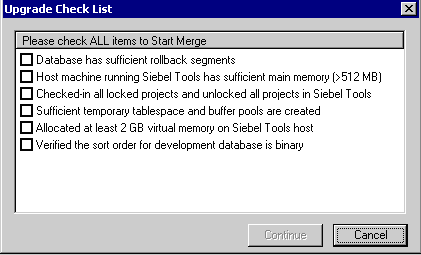- In the Upgrade Check List dialog box, you must confirm that your environment meets the requirements for a successful repository merge. Review each requirement and select the check box if your configuration meets or exceeds the requirement.