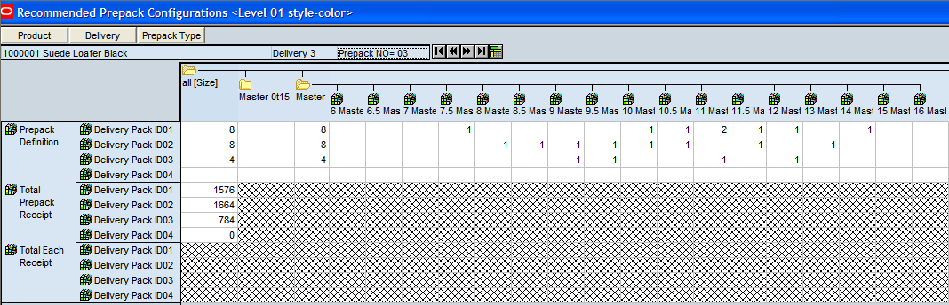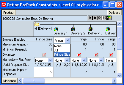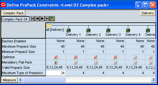Define Prepack Constraints Worksheet (Level L03), which you can use to define constraints for each DC Delivery. These include constraints such as the number of prepacks, pack sizes, flat packs, and eaches.