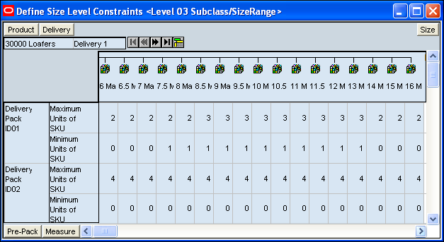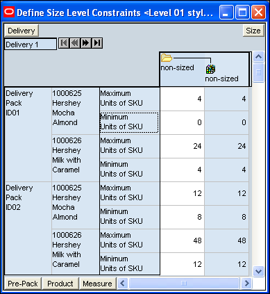 Define Size Level Constraints Worksheet (Level L02) , which you can use to define the size-level minimum and maximum limits for each prepack.