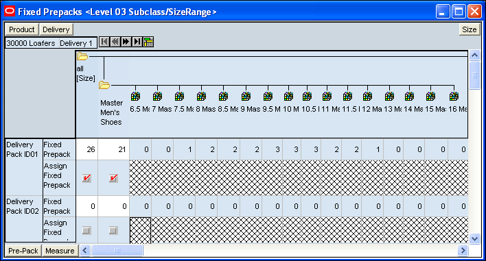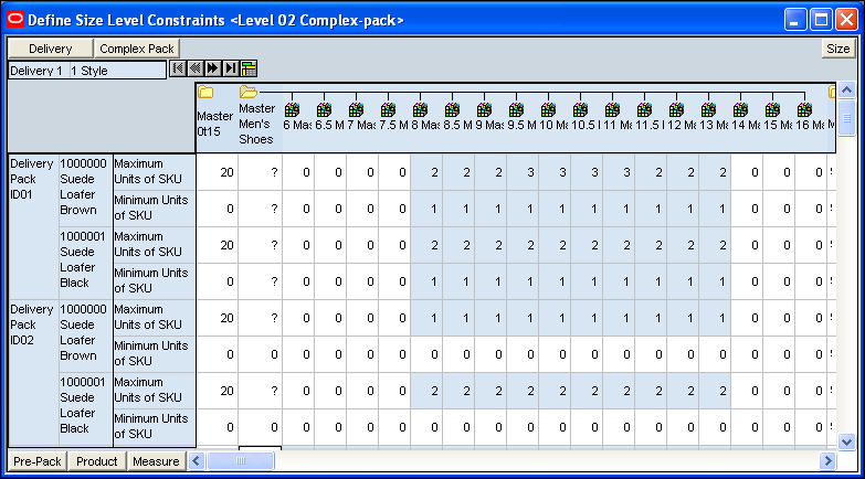 Use this worksheet to define size-level constraints for each prepack in each DC delivery. Although most non-fashion items are non-size, you can specify the minimum and the maximum units of SKU in a prepack using this worksheet.