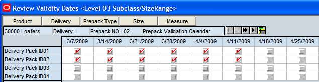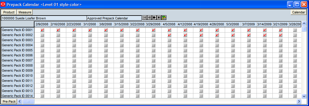 The Approved Prepack Calendar measure shows the validity period of each Generic Pack IDs, based on the DC deliveries they are attached to. Optionally, these validity dates may be enforced for purchase validations in downstream processes like AP and Allocation.
