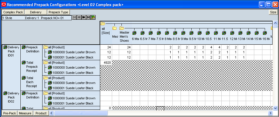 The example in the figure below shows the recommended combination of the two colors in the complex prepack. Each pack of the optimized prepack will contain 12 units each of Black and Brown. The tentative total quantity of this prepack configuration is also available.