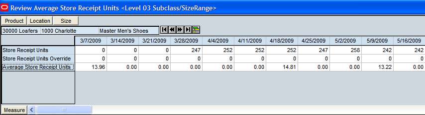 In Figure 7-42, note that the Store Receipt Units are displayed as the total units for the stores in Charlotte. However, the Average Store Receipt Units measure represents the average receipt units per style-color for the entire sub-class for this store.