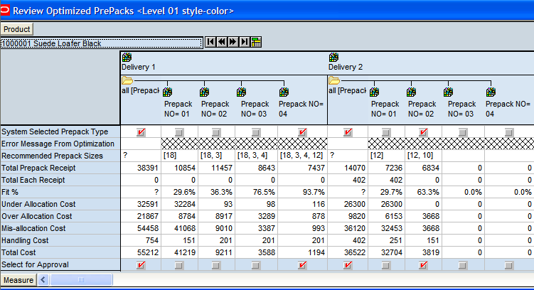 Prepack Optimization determines the optimal number of prepack configurations required to minimize misallocation of sales (resulting in lost sales or markdowns), while keeping the number of prepacks to a minimum (to reduce operational costs).