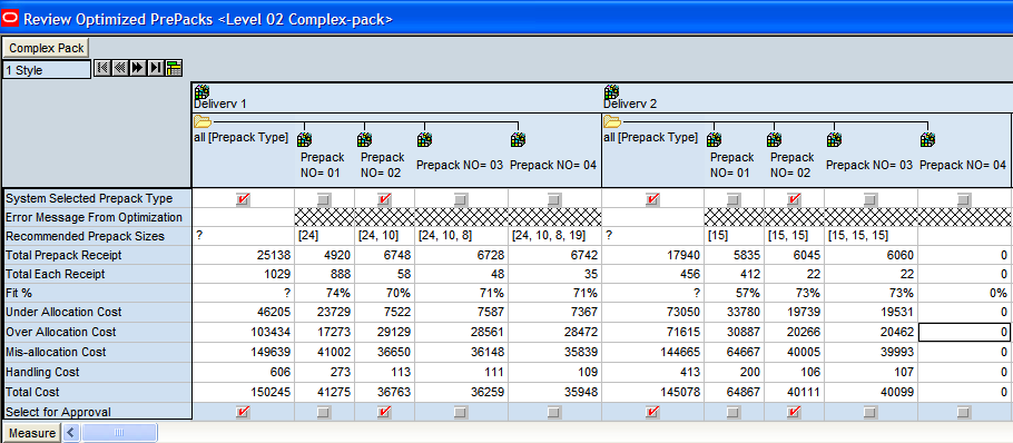 The worksheets of the Approve tab are similar for optimization of both single style-color (Level L01) and complex packs (Level L02). However, when you optimize for complex packs, perform a consolidated review for all the items that are packed together in each complex pack. For details on the worksheets of this tab, see Approve Tab (Level L01).