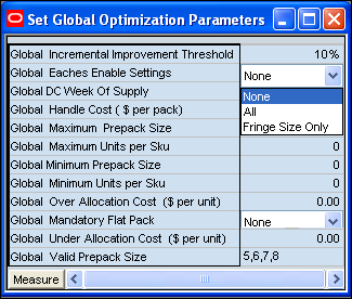 Use this worksheet to define the global parameters for prepack optimization. These values will take effect for all products unless default values are assigned using the Set Default Optimization Parameters Worksheet.