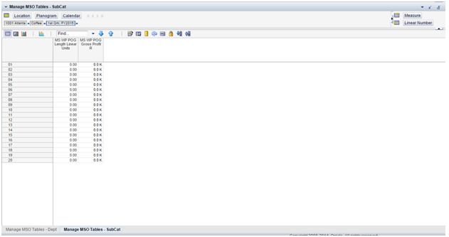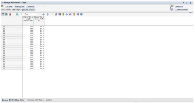 This step helps users to create/manage MSO tables for the POG Department and POG Sub-Category levels. The MSO tables are consumed by the special expression/API which generates optimized space and profits for the two POG hierarchy levels. The MSO tables can be systemically loaded using space elasticity models or through this step where administrators/implementation team populate the tables manually or systematically.