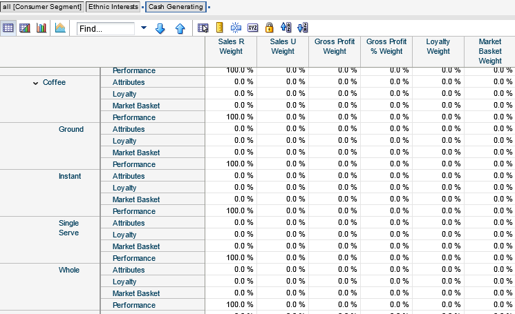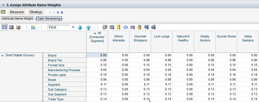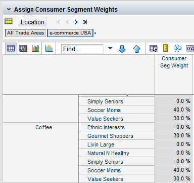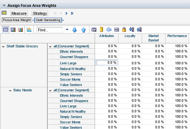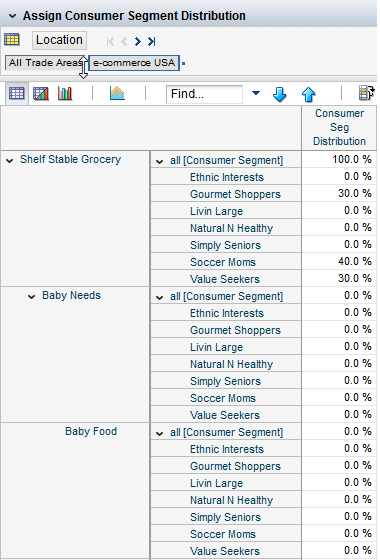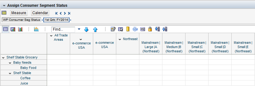 Use this view to assign primary consumer segments (or target consumer segments) to a category and store cluster. The Strategies exported to ORASE are identified by using the primary consumer segments defined here. Note that only a few strategies are assigned at the consumer segment level.