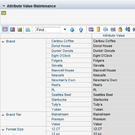 Product Attributes in RCM are stored in the form of Attribute Names and Attribute Values. Attribute Values are a list of product attributes for a specific Attribute Name. Examples of Attribute Names are Brand, Brand Tier, Size, Flavor, and so on. The following is an example of Attribute Values: