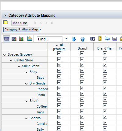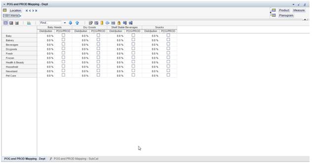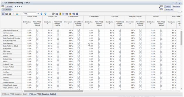 This view is used to define the relationship between the POG and PROD hierarchies at the sub-category level. The POG hierarchy (Y-Axis) is presented against the product hierarchy (X-Axis) in this view, so that mapping can be done between the POG Sub-Categories and Sub-Categories (from the PROD hierarchy). Select the relevant check boxes and set the distribution percentages.