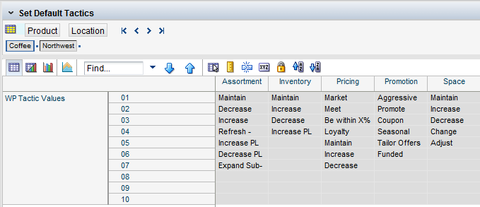 Use the Set Default Tactics view to maintain the superset of tactics (tactics values) for a retail business tactical area such as Assortment, Pricing, Space, and so on. Tactics are the possible approaches suggested in the category plan for a specific tactical area. For example, in the area of Assortment, tactic values could expand the assortment or increase Private Labels (PL). Tactics are assigned at the sub-category level in a category plan. This is done to maintain alignment to actions required at the sub-category level per the role and strategy assigned to achieve the business targets at the category level. Roles, strategies, and tactics are part of the category plan.