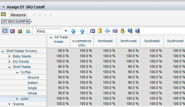 Use this view to define DT SKU CutOff %, which is used when applying Demand Transference to an assortment to calculate the No. of Significant Substitute SKUs for the substitutable demand from a SKU to its substitute SKUs. For more details, refer to the definition of DT SKU CutOff % in Table 3-17.
