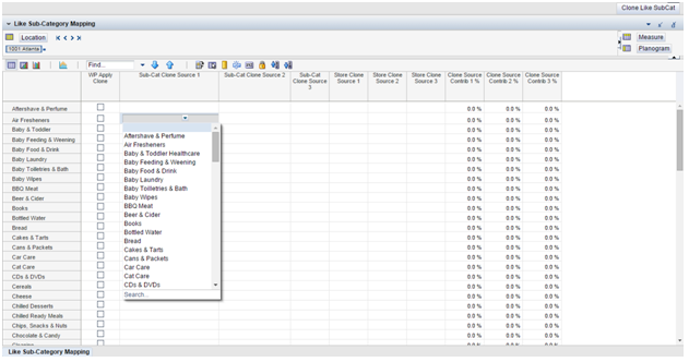 A new POG Sub-Category can be cloned, using a maximum of three existing Sub-Category/Store combinations, as a clone source. Choose the existing POG Sub-Categories (or Store) from the drop-down menu. Set the contribution percentage of the respective POG Sub-Category/Store combination being used to clone the new POG Sub-Category. Execute the Clone Like Sub-Category custom menu. The MSO tables for a new POG Sub-Category are populated on the basis of the defined contribution percentages.