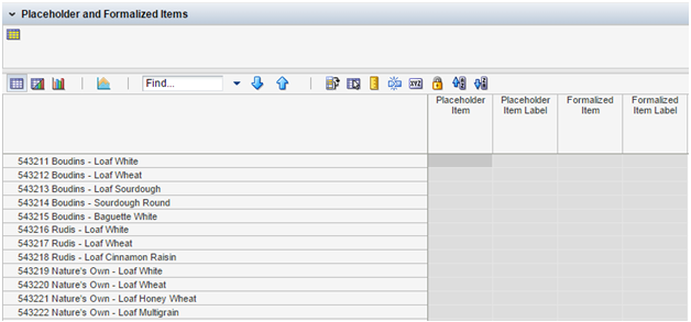 Imported formalization information from RMS or an MDM system is presented in this view. This is a read-only view. Formalization information consists of the mapping between formal items and placeholder items. Formalization information is stored in the Placeholder Item, Placeholder Item Label, Formalized Item, and Formalized Item Label measures.