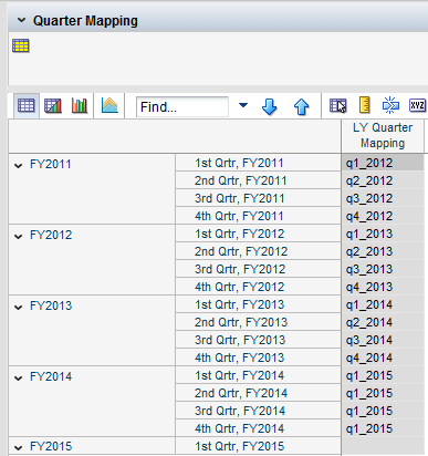 Use this view to assign and validate the last year quarter mapping. By default, the loaded file maps the last year as the same quarter last year. The mapping for any quarter can be reassigned in this workbook.