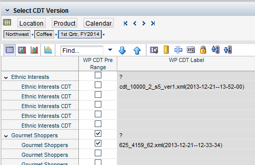 Use this view to select the CDT versions that are available in the workbook. A CDT version must be enabled here before it can be used elsewhere in the application. This action defines the pre-range mapping of CDTs, which governs their availability at the time of Assortment Planning workbook creation.