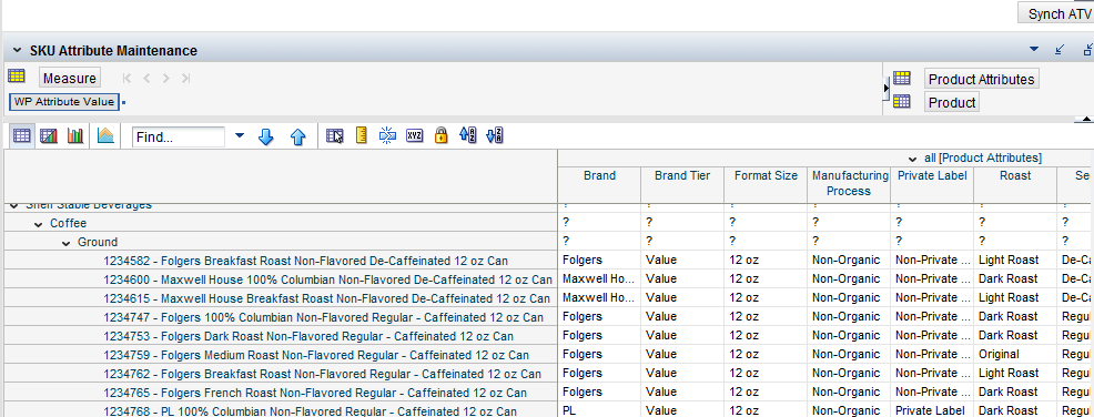Right-click on an Attribute Value position and use the Attribute Value Maintenance view to maintain product attribute values (attribute value) mapping to product attribute names (attribute name). Product Attributes, in general, refer to both Attribute Names and Attribute Values.