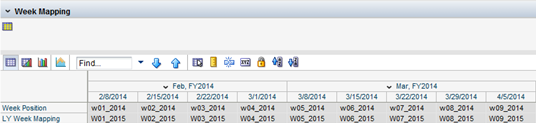 Use this view to assign and validate the last year week mapping. By default, the loaded file maps the last year as the same week last year. The mapping for any week can be reassigned in this workbook.