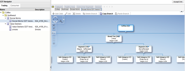 CDTs, with their dynamic hierarchical structure, help retailers gain insight into the consumer buying process, providing a visual representation (tree-like structure) of the relative importance of product attributes to a consumer segment in a product category. CDTs are used to rationalize and align assortments towards target consumer segments. RCM sources CDTs from ORASE. CDTs can be sourced from external parties such as manufacturers and market research companies providing syndicated data such as IRI, Nielsen, and so on.
