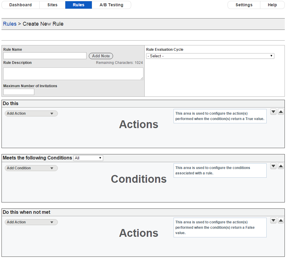 Maximum Number of Invitations: This is the maximum number of invitations that can be displayed to a visitor as a result of this rule. This value is compared against the number of invitations displayed during the visitor’s current session, and if the number of invitations displayed exceeds the maximum number for this site then there no more invitations are displayed to the visitor as a result of this rule.