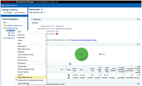 From the Navigation menu, under WebLogic Domain, right-click on the application domain and navigate to System MBean Browser from the context menu.