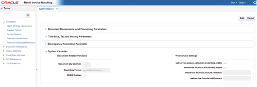 The URLs for the RFI Web services that are necessary for this integration are maintained in the RETAIL_SERVICE_REPORT_URL table and in the ReIM IM_SYSTEM_OPTIONS table.