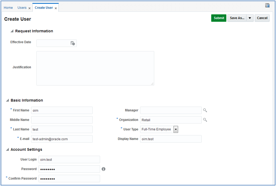 If you have batch of users that have to be created, the Oracle team can bulk load the users into the OIM Application. When users are bulk loaded their initial password will be set to the current password of a template user. The new users are required to change their password on their first login.