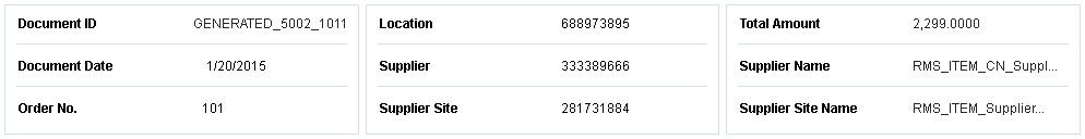 2. In the Order No. field, select the Purchase Order against which the Document (or Invoice) is raised. When Purchase Order is entered, the Vendor and Supplier site are populated with the supplier and supplier site (respectively) from the Purchase Order.