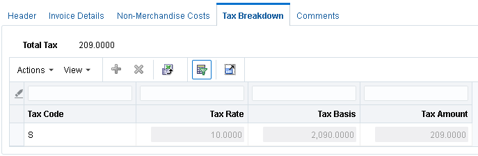 The Tax Detail section allows the addition of a single tax code, tax basis and amount to an invoice document as part of a quick entry flow. Additional codes and details may be entered using the Tax Breakdown window available on the Document Maintenance screen.
