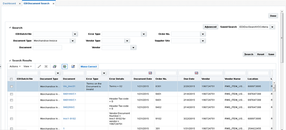 Mass Correction can only be used to fix two types of errors: Invalid Items and Invalid Purchase Order Numbers. If none of the documents selected are eligible for mass correction (that is, do not have Invalid Item or Order Number error), an error is displayed.