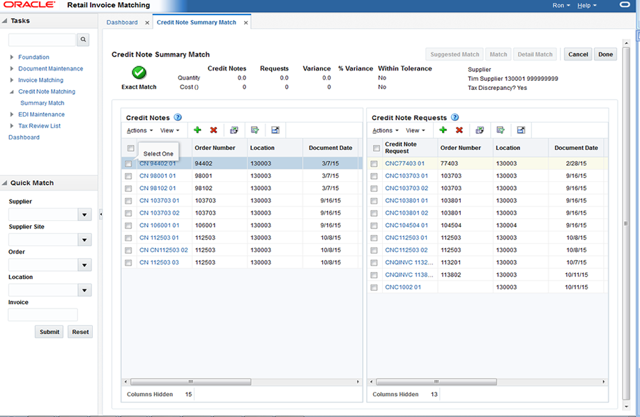 If the selected CNs and CNRs are within line level tolerance, click Detail Match. The selected items are flagged as cost and quantity matched and the status on the selected items is changed to matched.