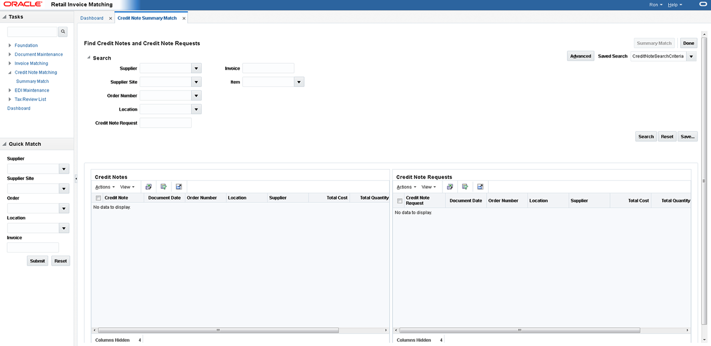 Credit Note Auto-Matching pairs credit note requests to corresponding credit notes sent by the supplier. The CreditNoteAutoMatchBatch attempts auto-matching of credit notes from suppliers, to credit note requests from the retailer without manual intervention. The batch also creates and resolves detail level discrepancies utilizing a predefined set of reason codes. These reason codes are defined within Invoice Matching through the System Options Maintenance screen. In addition, the batch utilizes a variety of configurable keys to allow for document groups to be matched in ways other than just distinct purchase order and location combinations.