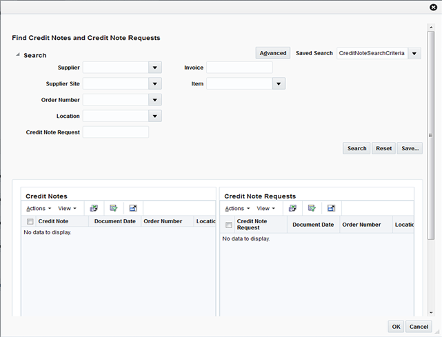 Determine whether a CN or a CNR are needed to reach tolerance. From the Action menu of the CN or CNR list, select Add. The Find Credit Notes and Credit Note Requests dialog is displayed.