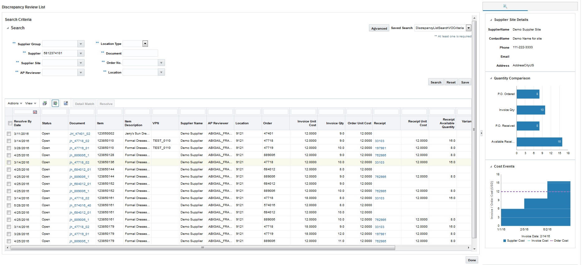 The Supplier Site Details report will provide you the necessary information to get in contact with the supplier site they are working with. This report will be visible in the BI pane when you are in the Discrepancy Review List window as well as the Summary Match window.